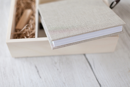 Sa box, faite entièrement en bois avec un couvercle à glisser, est divisée en deux compartiments. Un premier emplacement est prévu pour le mini album. Celui-ci est en lin beige en format 15x15cm. Il contient 30 double-pages. Quant au second emplacement prévu, il est dédié pour la clé usb en bois. Celle-ci, contient vos fichiers numériques en haute définition.